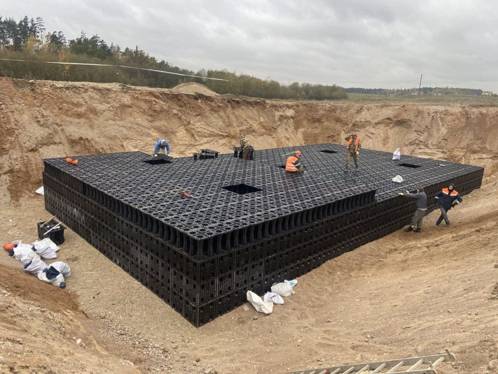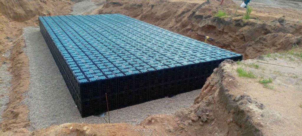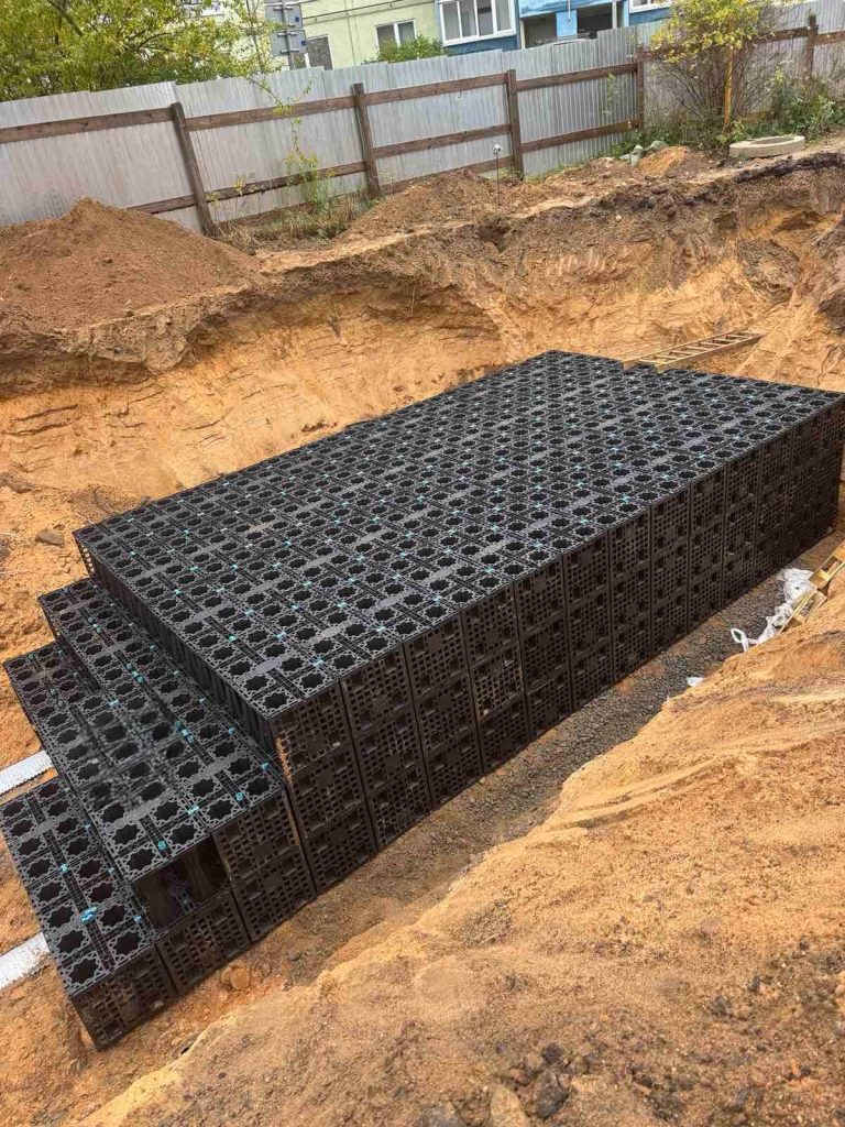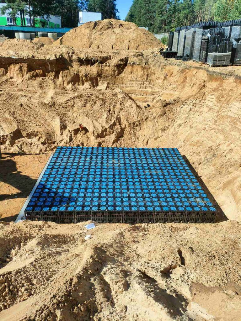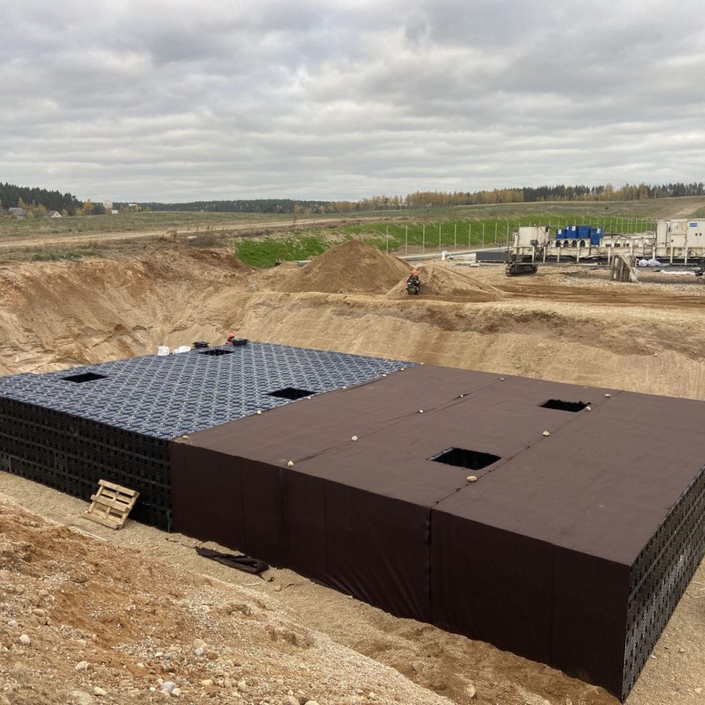 Собранный из модулей резервуар для инфильтрации воды покрывается нетканым геотекстилем. Очищенные стоки попадает внутрь, накапливается и постепенно просачивается в почву сквозь геотекстильное полотно.
