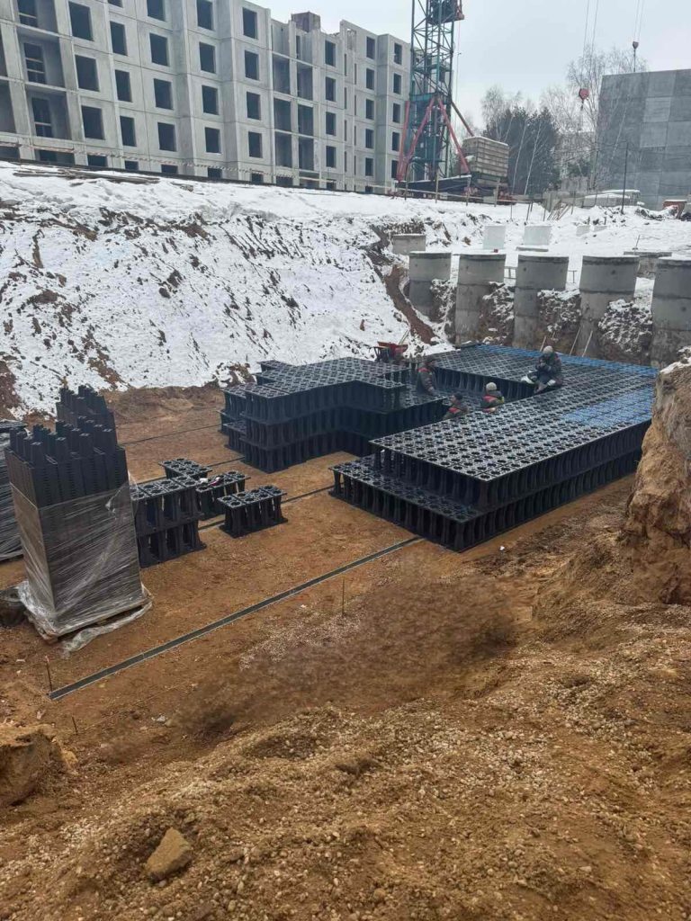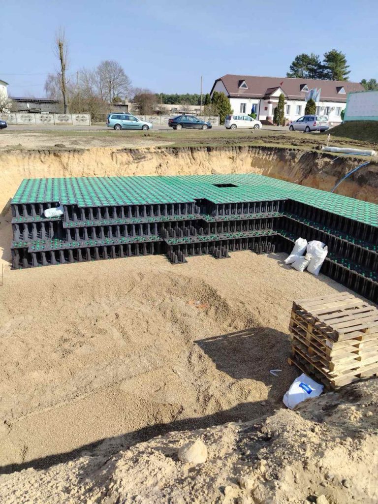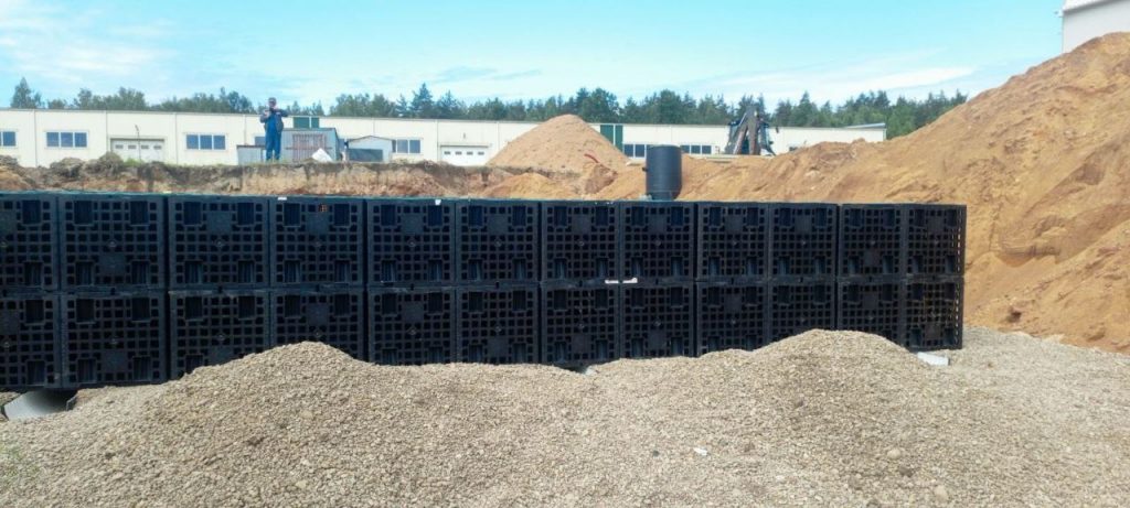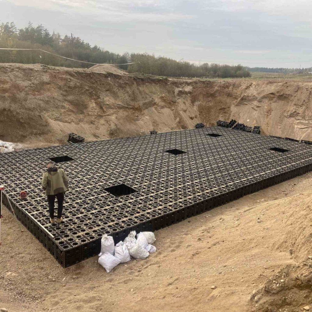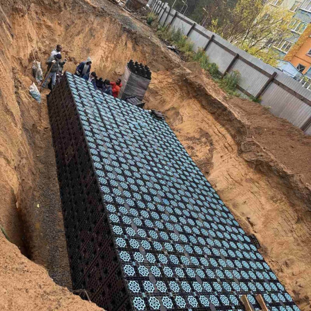Собранный из модулей резервуар для инфильтрации воды покрывается нетканым геотекстилем. Очищенные стоки попадает внутрь, накапливается и постепенно просачивается в почву сквозь геотекстильное полотно.
