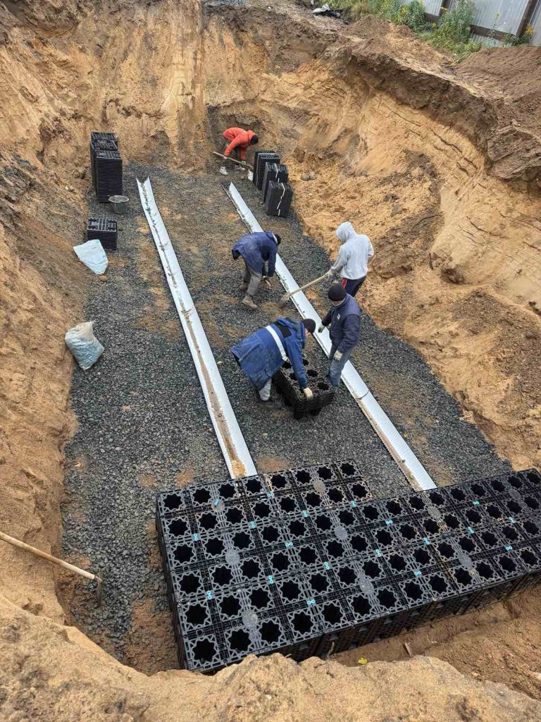 - Уплотнение: Засыпка производится послойно (каждые 20-30 см) с обязательным уплотнением виброплитами или ручными трамбовками. Использование тяжелой строительной техники непосредственно над модулями до полной обратной засыпки запрещено.